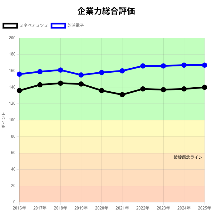 大王製紙の総合評価は、健全経営の基準とされる100ポイント付近で推移しており、改善余地が大きい。